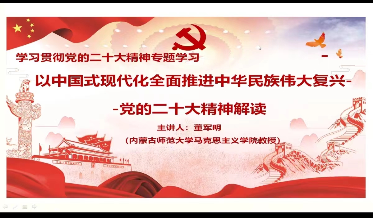 宣讲团成员马克思主义学院董军明教授做了题为《以中国式现代化全面推进中华民族伟大复兴--党的二十大精神解读》的报告,由学院党委书记张裕凤教授主持,全院全体教师参加。
