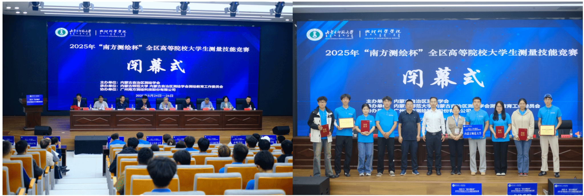 韩巍副校长、内蒙古自治区测绘学会刘秀理事长等领导致辞,裁判员代表叶志刚、选手代表敖登毕力格宣誓。5月25日,线下竞赛激烈进行,四等水准测量和一级导线测量分A、B两组在西操场等场地展开,选手们操作仪器严谨规范。5月25日晚,闭幕式暨颁奖仪式隆重举行,为各奖项得主颁奖。