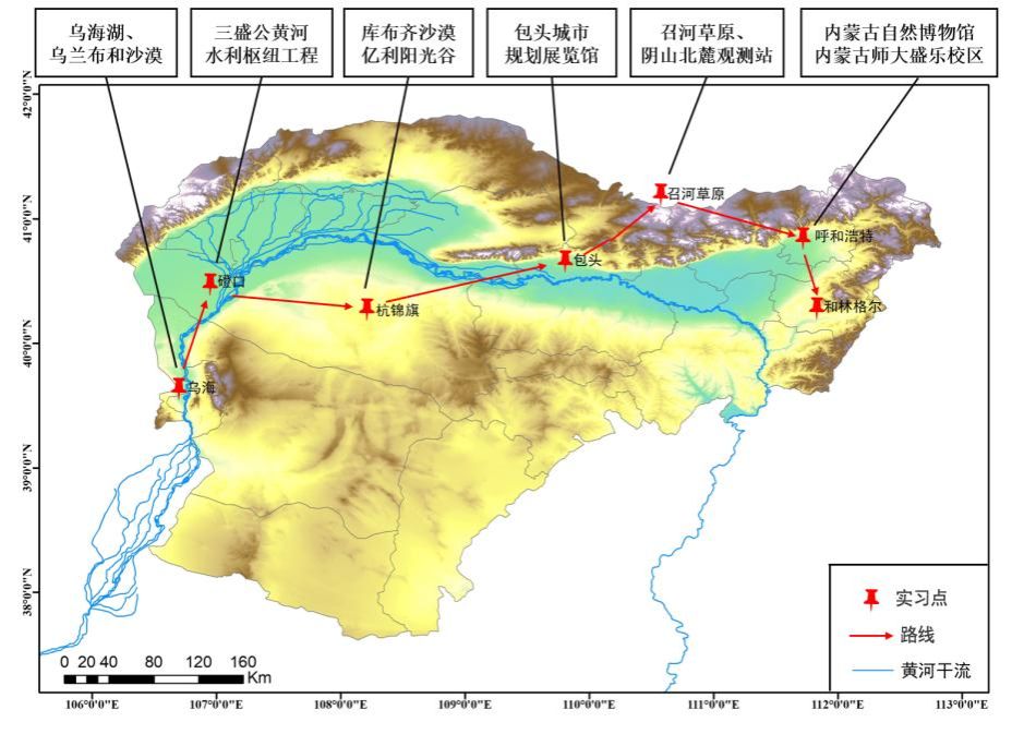 在8月3日至7日全程统筹内蒙古段的实习任务,沿黄河“几”字弯依次深入乌兰布和沙漠、三盛公水利枢纽、库布齐沙漠、亿利阳光谷、包头城市规划展览馆、阴山北麓草原生态水文野外站、希拉穆仁草原及内蒙古自然博物馆等典型区域,由长安院长亲自领队,苏根成、塞西雅拉图、春喜等学院13位教师围绕干旱区地貌演化、风沙治理、草原生态、人地耦合等主题展开深度讲解。